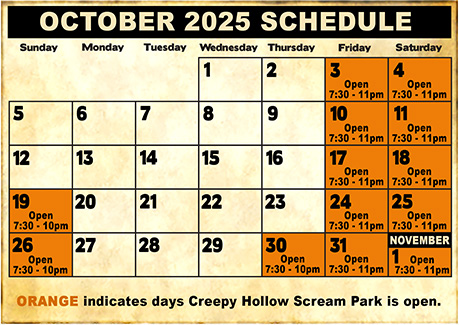 2025 Schedule Gates open at 7pm and the screams start ~7:30. Tickets are sold until 11pm on Fridays & Saturdays and until 10pm on Thursdays and Sundays. We will run the events until everyone gets through.